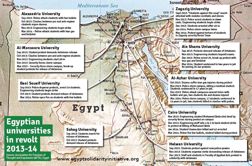 The briefing sets the current repression in the context of the gains made during the 2011 Revolution, when students and university staff managed to win important freedoms and force the security forces to withdraw from the universities. Based on interviews, research visits to Egypt and Arabic data from local human rights organisations, the briefing aims to equip activists outside Egypt with the background information they need to build effective campaigns in solidarity with students and university in Egypt facing repression.