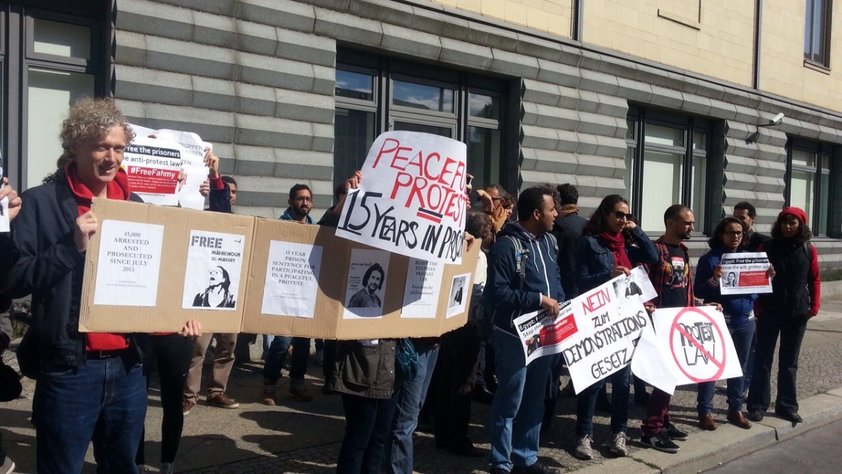 Berlin #noprotestlaw demonstration Published June 21, 2014 at 1280 × 720 in International solidarity lifts #noprotestlaw campaign while Cairo march attacked ← Previous Next → Protesters gather in Berlin for #noprotestlaw action 21 June
