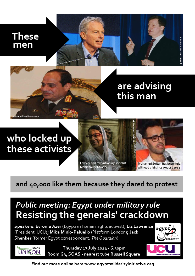 Egypt’s military regime has unleashed a violent crackdown against all forms of dissent. Activists who led the revolution in 2011 are now behind bars on trumped up charges or simply for taking part in peaceful protests. Hundreds of regime opponents have been condemned to death in trials which Amnesty International called ‘grotesque’. Journalists are being jailed for up to ten years as the generals try to stifle any kind of criticism.