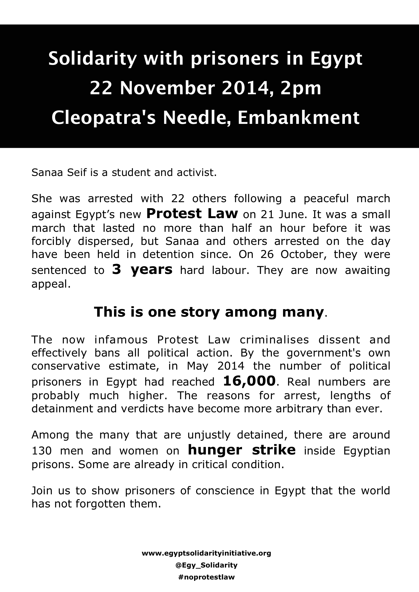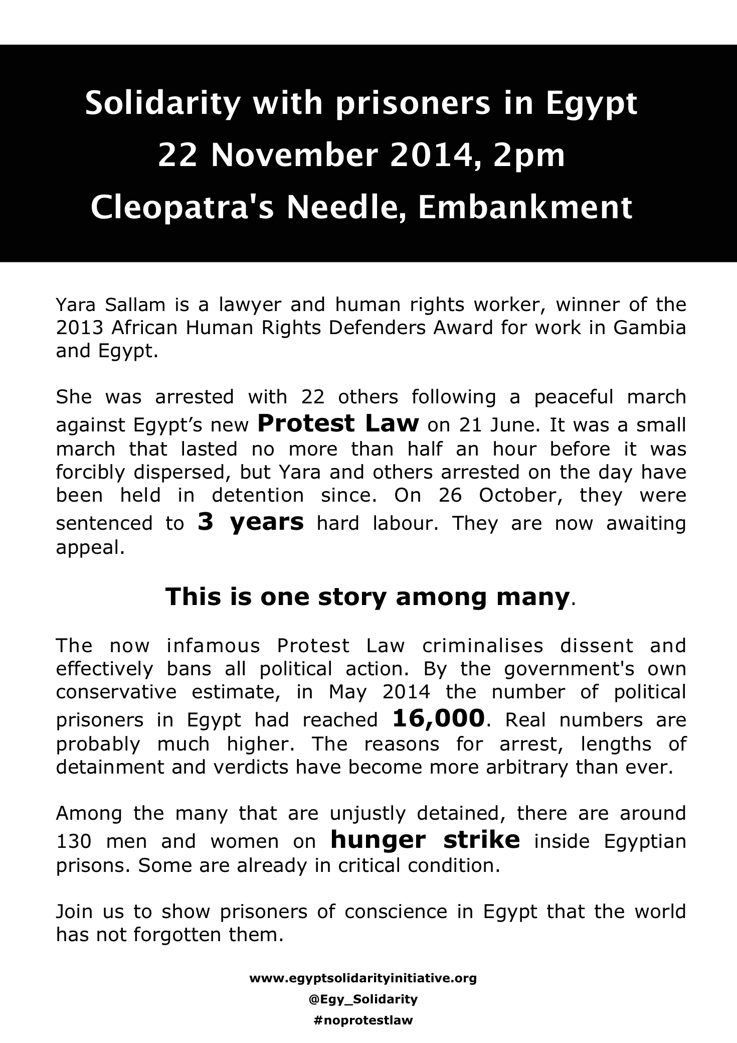 Resources: leaflets for London protest against repression in Egypt 22nd November egyptsolidarityinitiative / November 11, 2014 Leaflet side 1 (Sanaa) Leaflet side 2 (Sanaa) Leaflet side 1 (Yara) Leaflet side 2 (Yara) Share this: Share on X (Opens in new window) X Share on Facebook (Opens in new window) Facebook Like Loading...