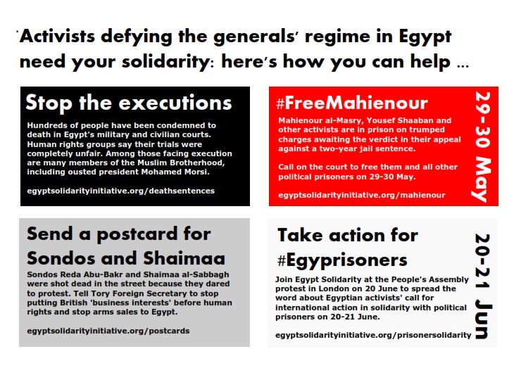 In the UK Egypt Solidarity will be leafleting the People’s Assembly demonstration on 20 June – look out for more details on the website.