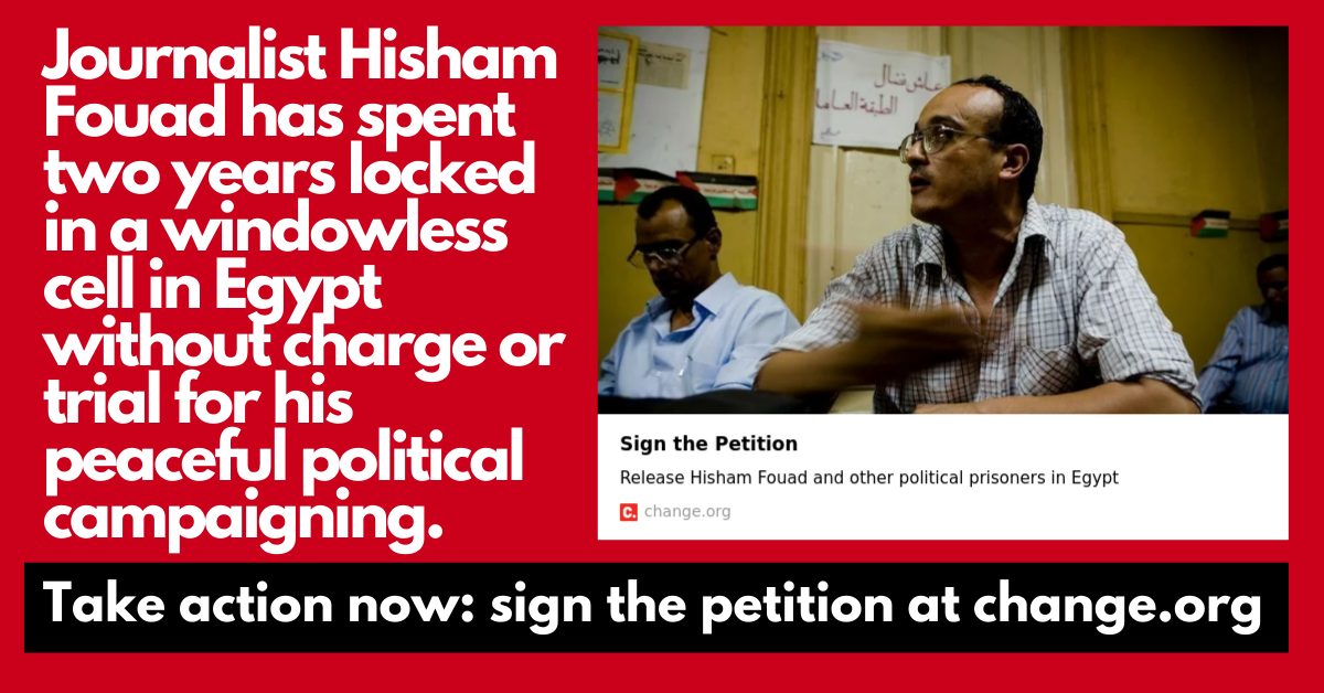- Tweet this or share on Facebook: Journalist Hisham Fouad is locked in a windowless cell in Egypt for his peaceful political campaigning. After 2 years without charge or trial @alsisiofficial and @mfaegypt must release him now. #EgyptSolidarity http://www.change.org/releasehishamfouad