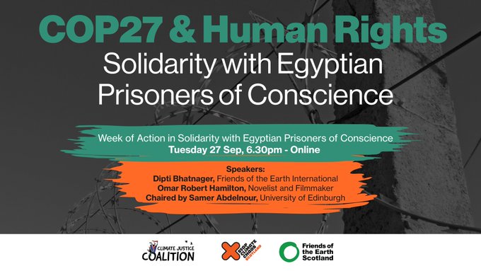 Major climate organisations in Scotland and Britain are calling for a week of solidarity with Egyptian prisoners of conscience in order to highlight the Sisi regime’s horrific abuses of human rights. Climate Justice Coalition, Friends of the Earth Scotland and Stop Climate Chaos Scotland are hosting an online meeting to kick off the week’s activities on 27 September.