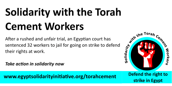 Workers at the Torah Cement company in Egypt are the latest to face repression for daring to demand their rights, after 32 workers were given 3 year jail sentences for taking part in a sit-in to demand permanent contracts. They will be appealing their sentences on 18 June and Egyptian trade union and human rights activists are appealing for international solidarity to highlight the case.